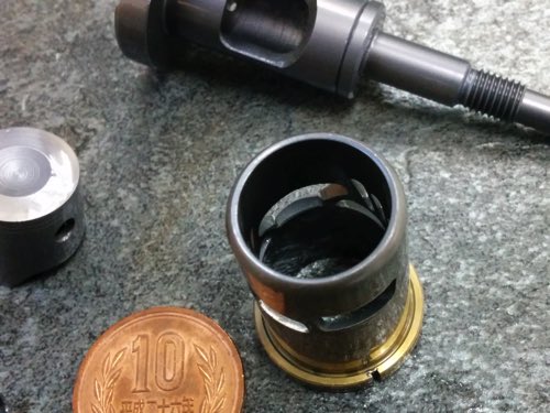 左からピストンピン、ピストン、クランクシャフト、シリンダーです。